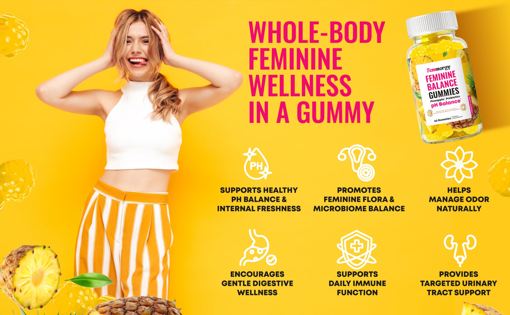 - Pineapple-Flavored Daily Feminine Care: Enjoy a simple and delicious way to support feminine health, freshness, and daily balance. Naturally flavored with pineapple, each chewable has a pleasant fruity taste and is free from artificial sweeteners or sugar. It fits easily into any wellness routine. Femnergy pH Balance Gummies for Women is a gentle, clean option designed for consistency, helping women feel supported, confident, and refreshed from within every day.