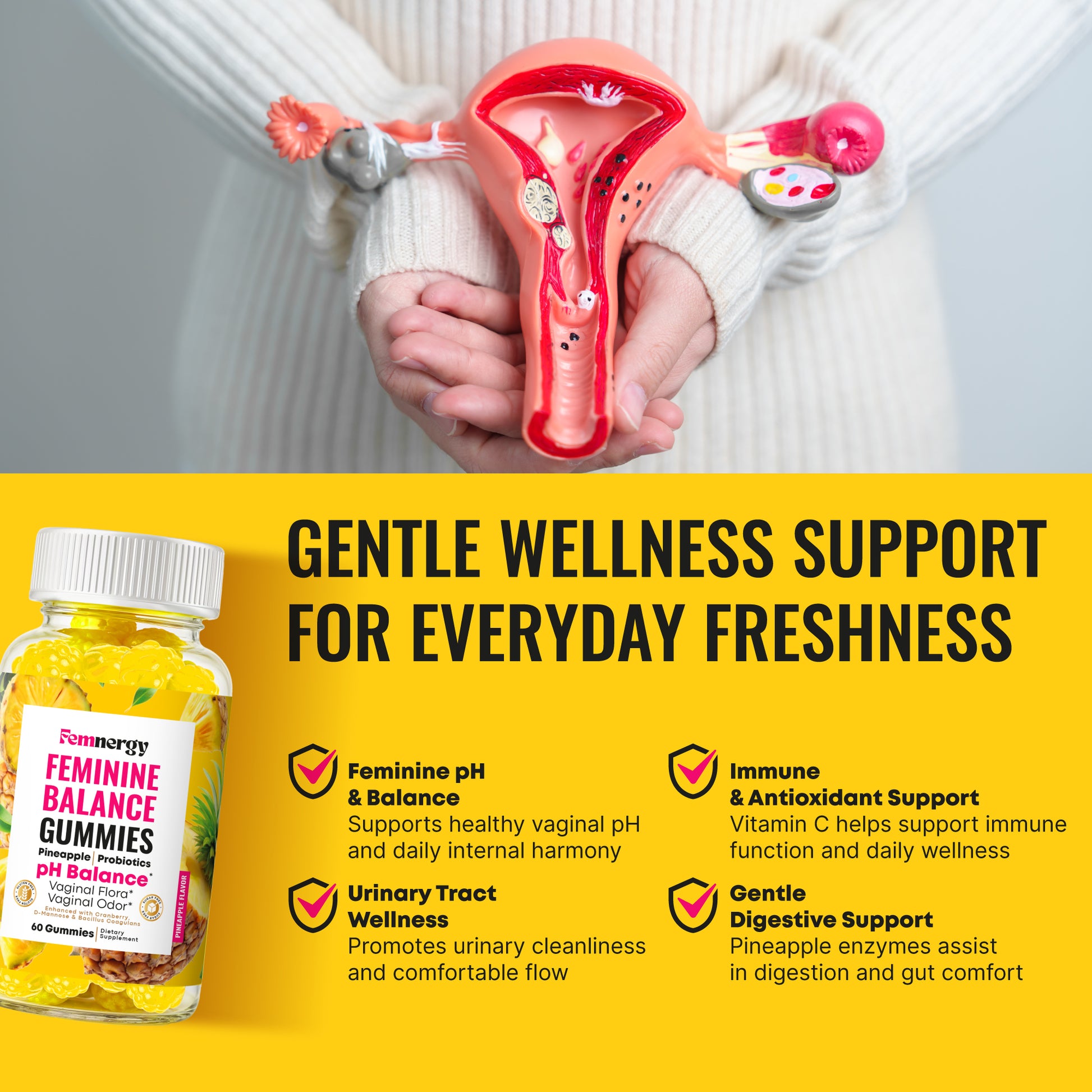- Supports pH Balance and Feminine Comfort: Femnergy Feminine Balance Gummies is formulated to support the body’s natural pH balance, a key factor in maintaining daily feminine wellness. Balanced pH levels help promote internal comfort, freshness, and a healthy environment. This Women's daily gummy supplement combines probiotics, D-Mannose, cranberry extract, and pineapple fruit powder to help maintain harmony from within.